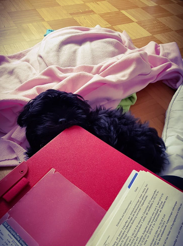 Pinot weiß es inzwischen, uns gut auf Trapp zu halten. Gerade in der Zeit des Einzuges bis zum 27.07.2017 stand ich in der Vorbereitung auf meine mündliche Abschlussprüfung. Für Pinot war ich "die Mama" - er wurde in der kurzen Zeit zu meinem Schatten und wollte überall Teil sein mit ich mich beschäftigt hatte. Hier ein super Bild wie er mir sagt, komm mach mal Feierabend, es ist Zeit zum kuscheln. Er Biss mir regelrecht in meinen Ordner, wenn er dachte, jetzt hast du aber genug gelernt :)